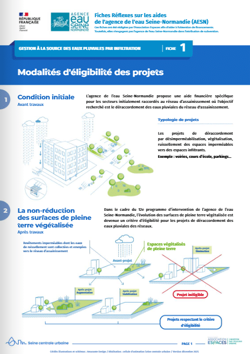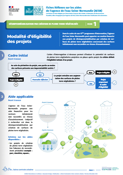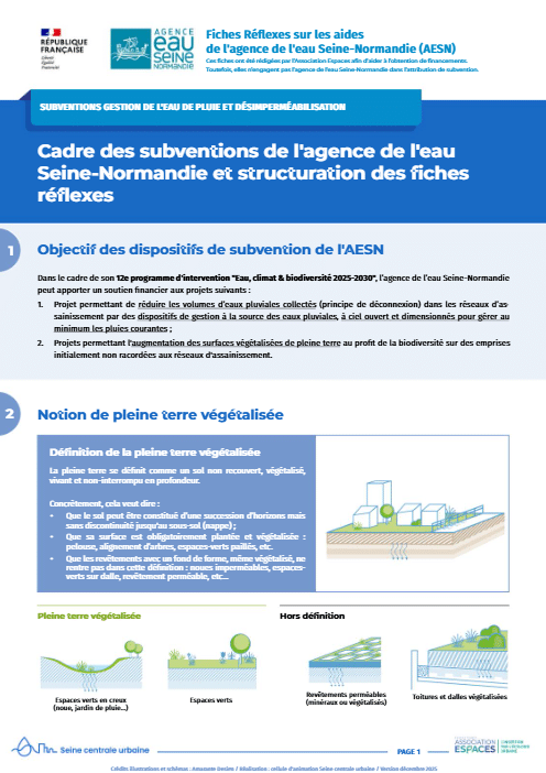 L’association Espaces a rédigé un recueil de « fiches réflexes » regroupant des informations facilitant l’obtention des subventions auprès de l’agence de l’eau Seine-Normandie (AESN), de la Région Ile-de-France et de la Métropole du Grand Paris sur la thématique « gestion à la source des eaux pluviales et désimperméabilisation de l’espace urbain ».
